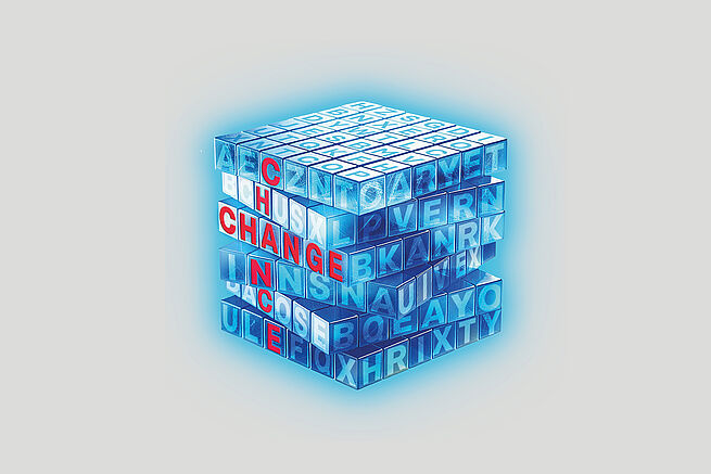 A futuristic AI-generated Rubik’s cube represents Koenig & Bauer’s transformation into an agile technology company. It shows the word “change” turning into “chance”, symbolising the fact that every change brings countless new opportunities.